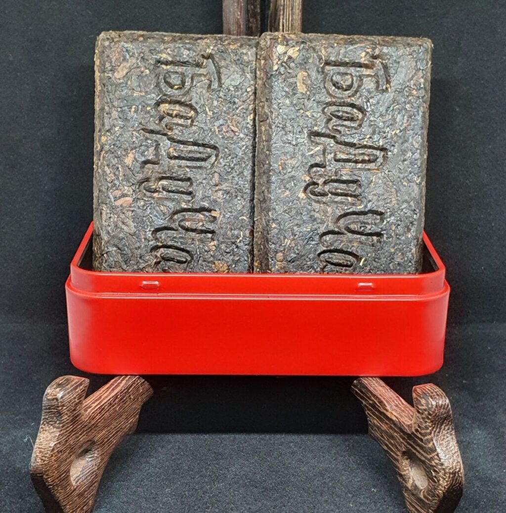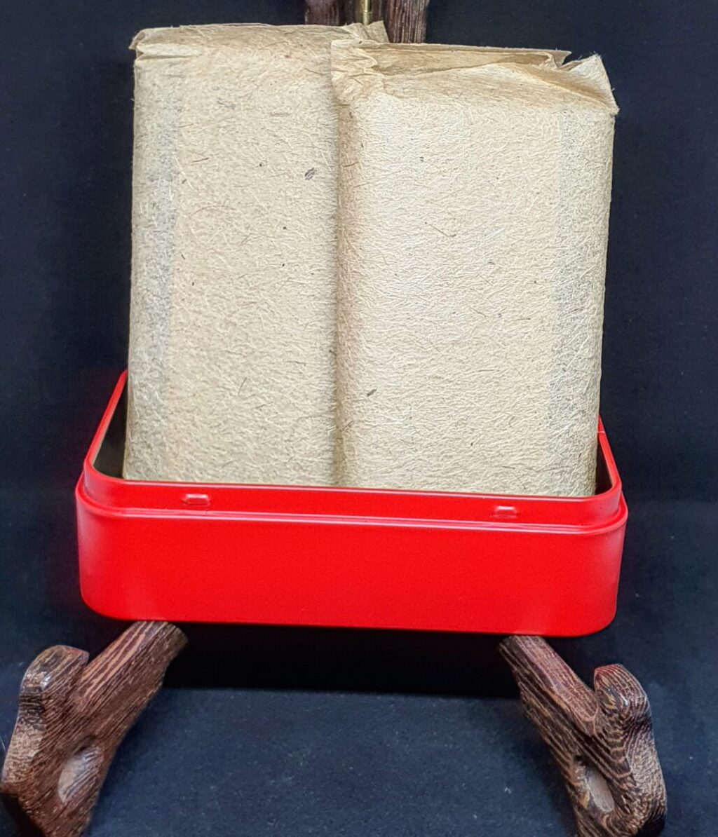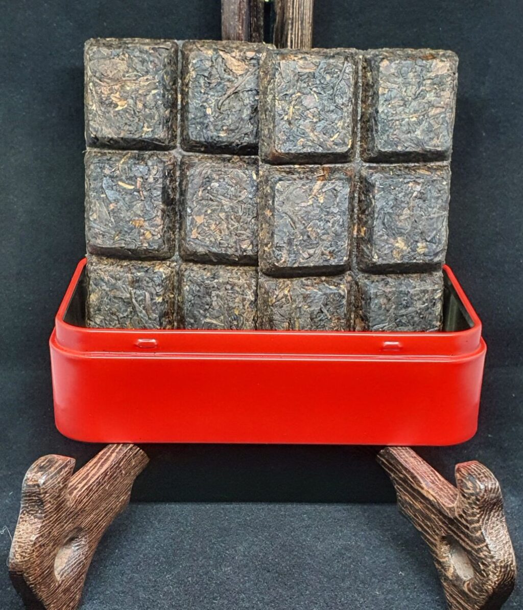 This tea is produced in Guan Dong village in the Tun Mu Reserve. The batch is divided into two parts: one part is made into smoked tea, and the other part into Da Chi Gan. This tea was a delightful discovery, as it combines tenderness, sophistication, subtlety, and powerful fruity flavors, while retaining all the qualities of a red tea such as its tartness, fiery taste, and strength. Because the tea is heated over steam, pressed, and then dried again during the pressing process, the taste is deeper and more powerful than that of loose leaf tea. The tea is conveniently stored in a box with two 50g bricks, perfect for serving.